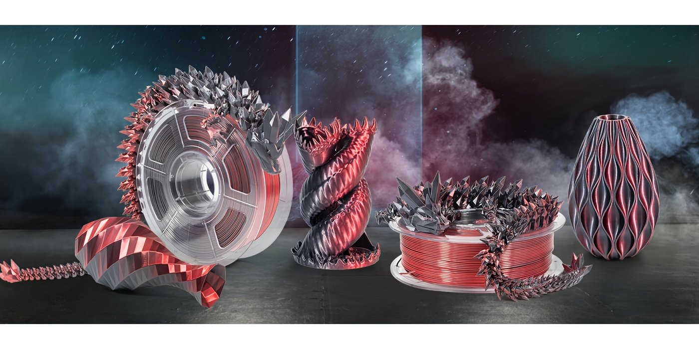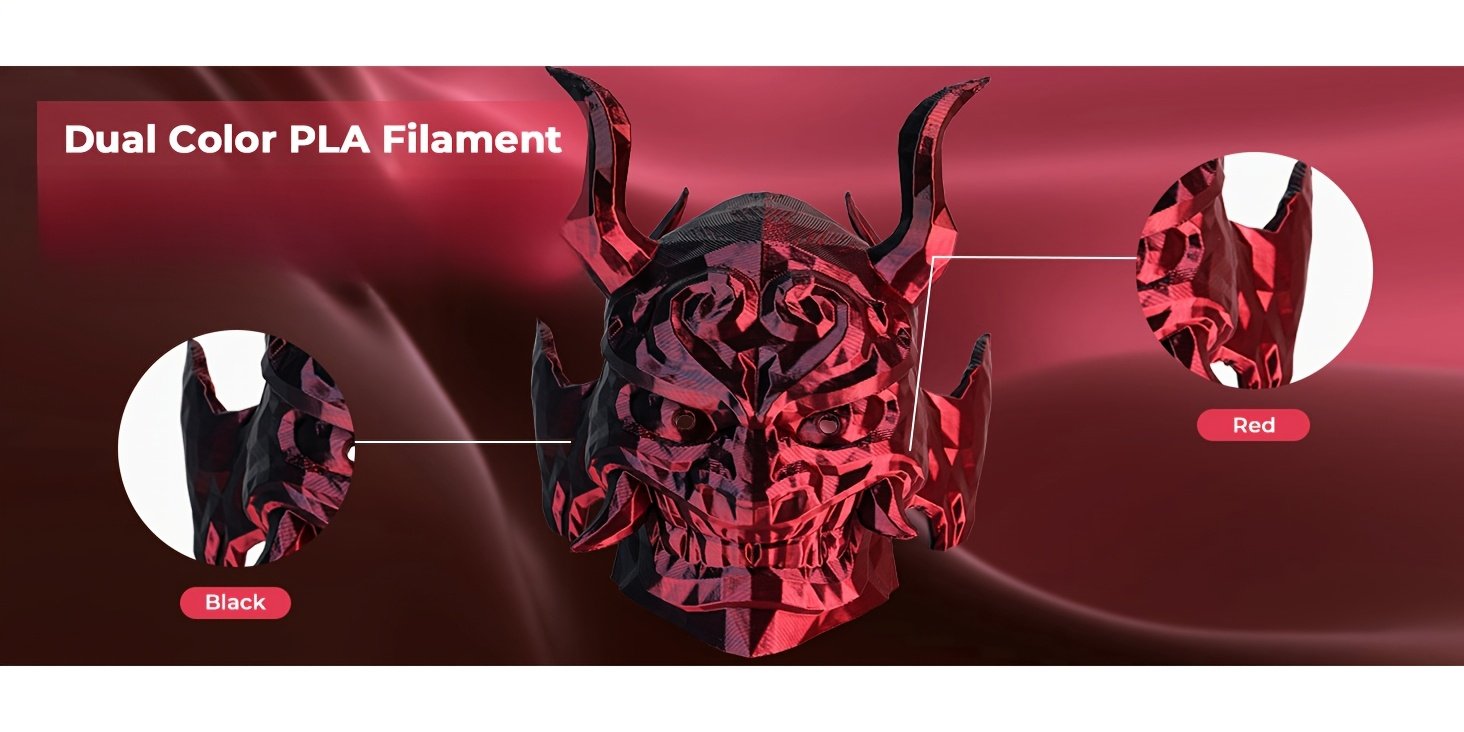 Create dramatic, high-contrast prints with ECCRT Black & Red Dual Color Silk PLA. This filament features a unique co-extruded design where Black and Red colors run parallel along the entire strand. The result is a stunning color-changing effect: your 3D printed model will look red from one angle and black from another, adding a mysterious and dynamic visual appeal to dragons, vases, and artistic sculptures.