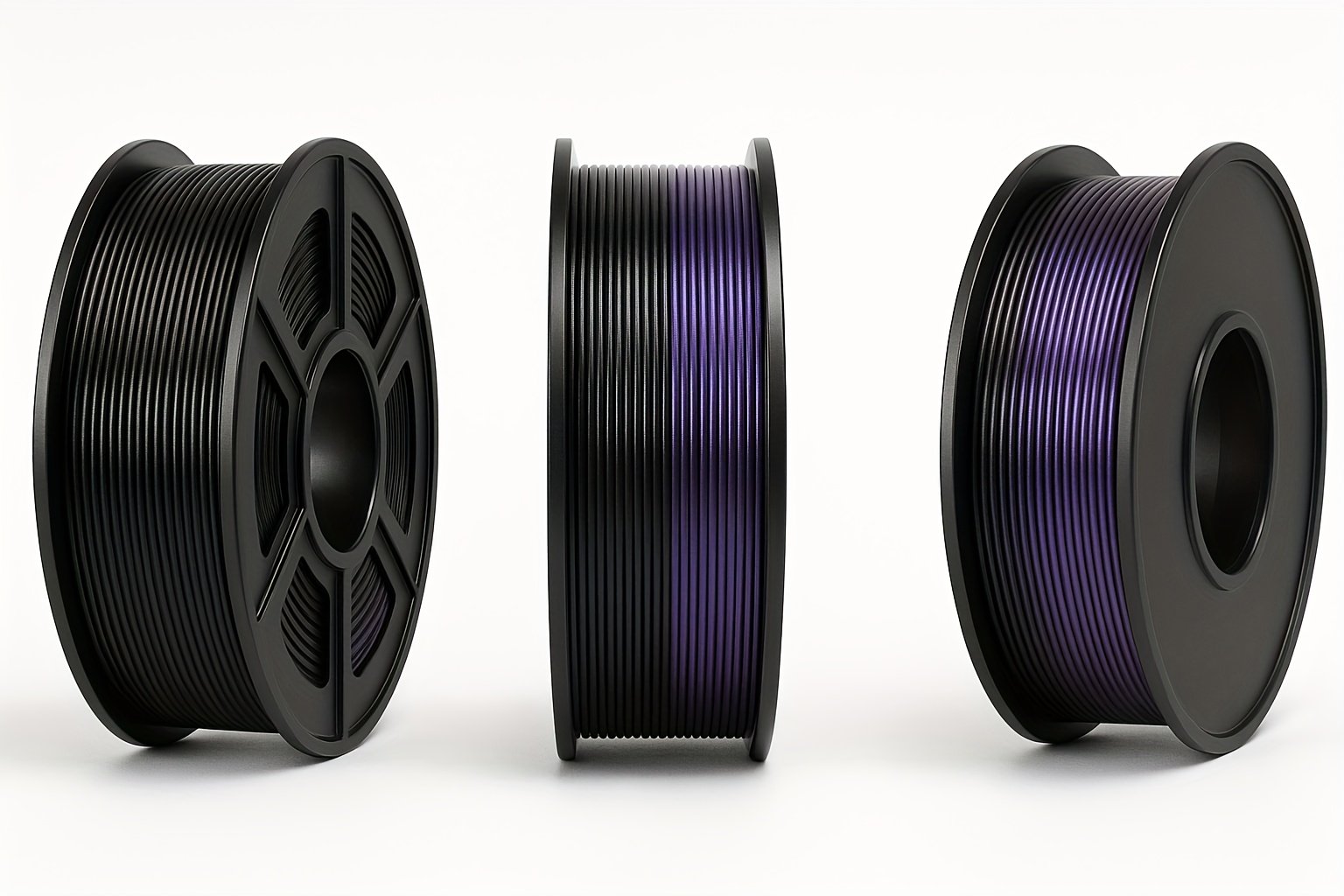 - 🎨 Exclusive 4-Pack Color Mix: This bundle includes 2 Spools of Dual-Color (Black & Purple) and 2 Spools of Tri-Color (Black, Purple & Gold). The co-extruded colors rotate along the filament, creating a magical color-shifting effect on your finished prints without needing a multi-material printer.